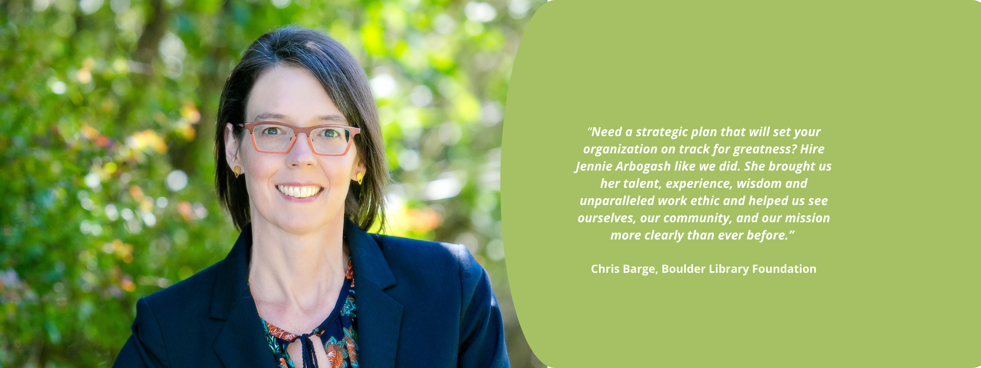 At Jennie Arbogash Consulting, we’ve experienced the opportunities and challenges facing your organization and provide service combining excellent practice with a pragmatic approach. Our people-centered consulting comes from a passion for helping you run your nonprofit business well, while improving the impact for your participants, donors, staff and board.